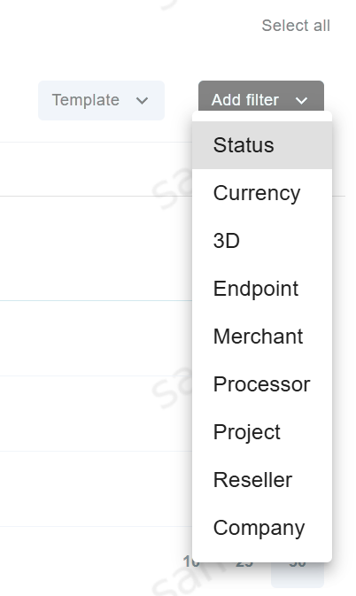 - Gate is disabled.To add new search filters, click the Add filter button. It possible to filter by: Status, Currency, 3D, Endpoint, Merchant, Processor, Project, Reseller and Company.