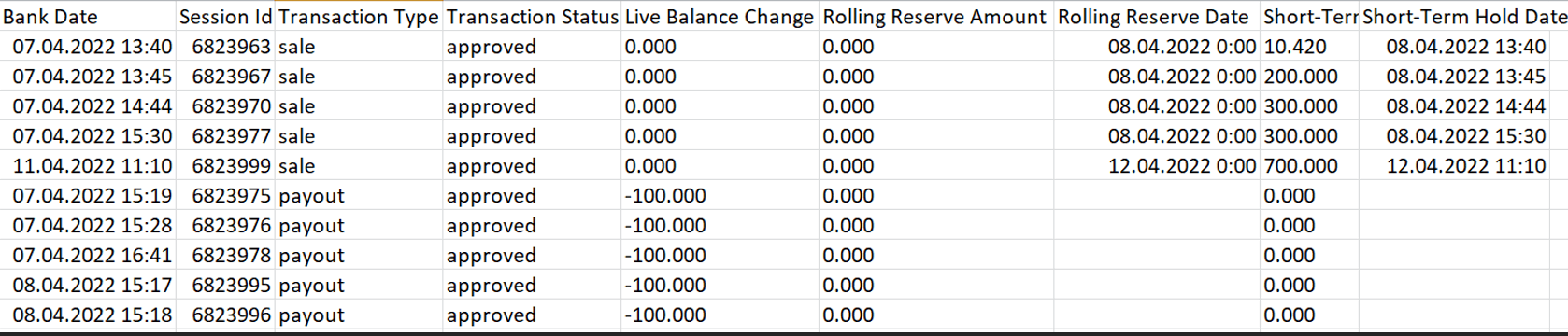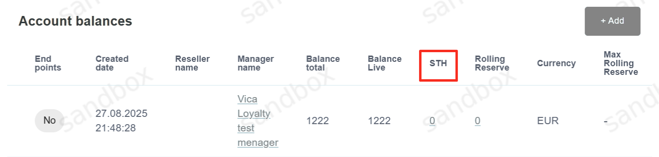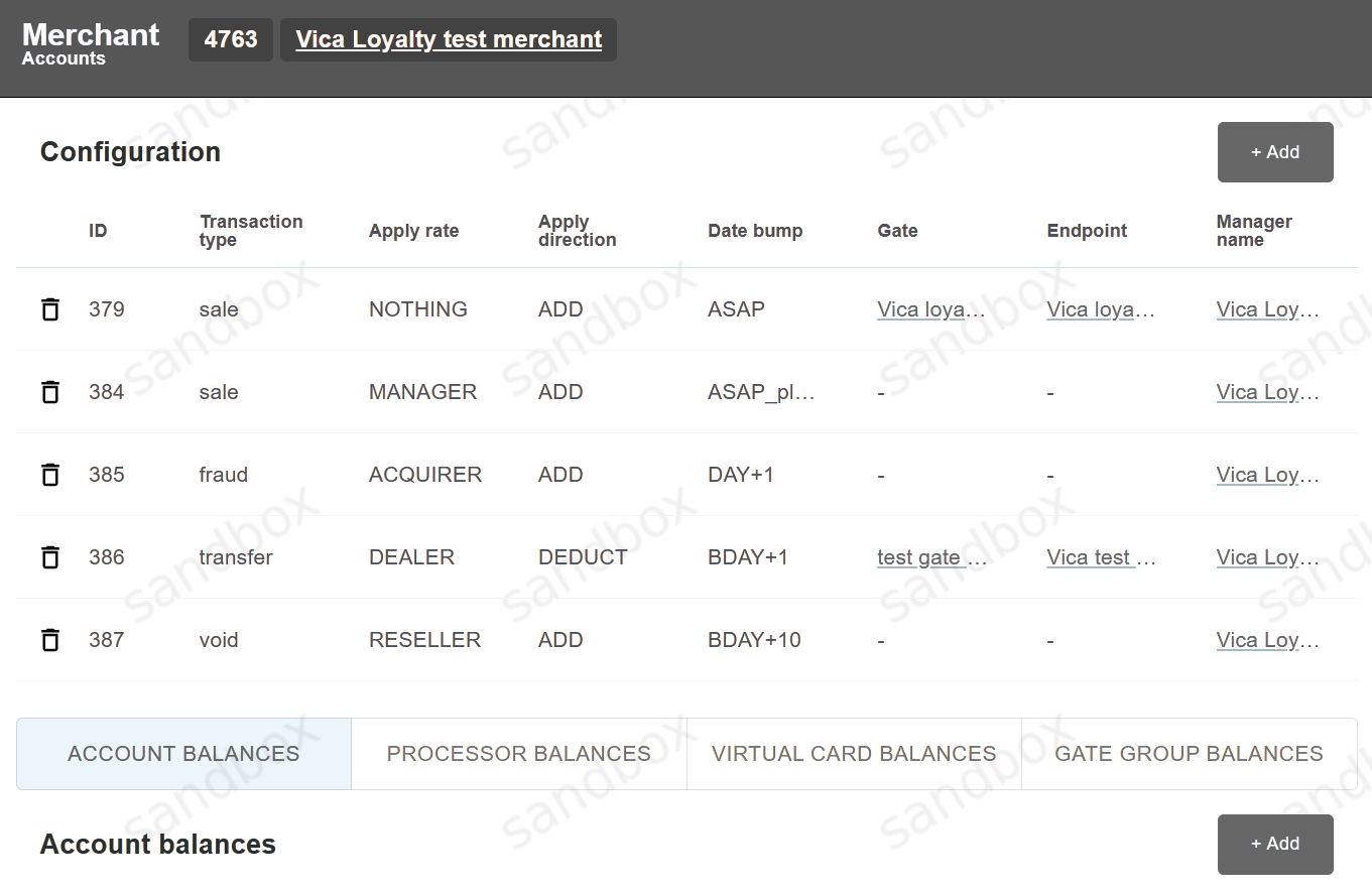 Manager can configure and view multiple balances for each Merchant account and request balances by API with manager access. These balances calculate the total accumulated funds from transactions associated with Merchant. Balances calculation supports configured rate plans, including STH - Short-Term Hold and RR - Rolling Reserve.