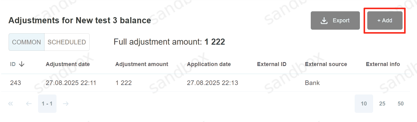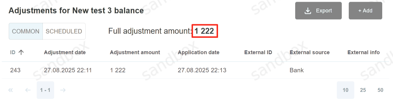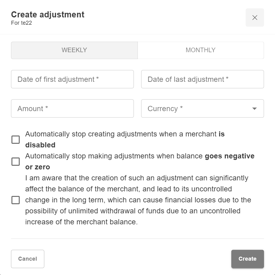 • I am aware that the creation of such an adjustment can significantly affect the balance of the merchant, and lead to its uncontrolled change in the long term, which can cause financial losses due to the possibility of unlimited withdrawal of funds due to an uncontrolled increase of the merchant balance. This checkbox is mandatory
