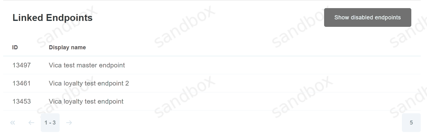 This section by default display enabled linked endpoints to merchant. By selecting Show disabled endpoints the sheet will be replaced and will display disabled linked endpoints.