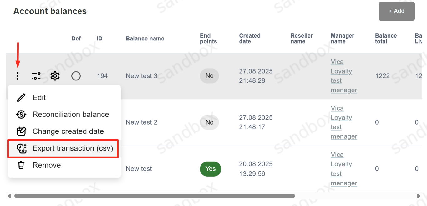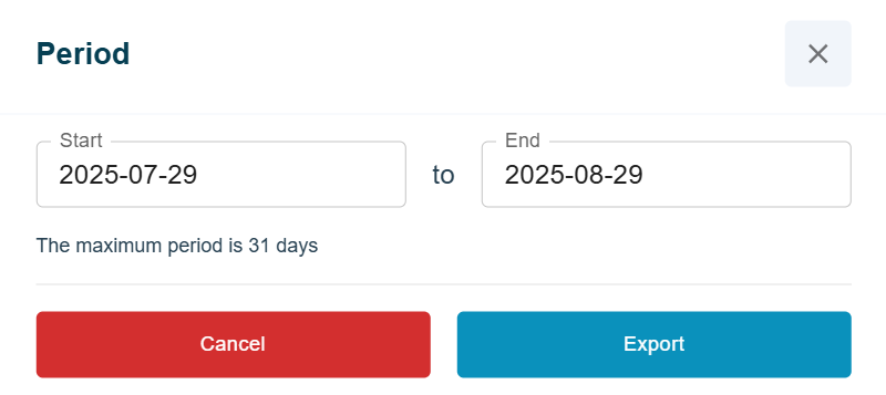 To export balance transactions press on Export Transactions button and select transactions’ period: