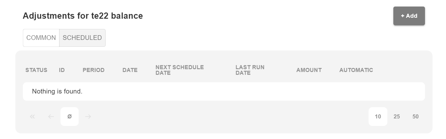 This functionality helps to configure a monthly/weekly fee, which can be set up on the appointed dates every month/week. Scheduled for balance adjustments can be made via Add+ button :