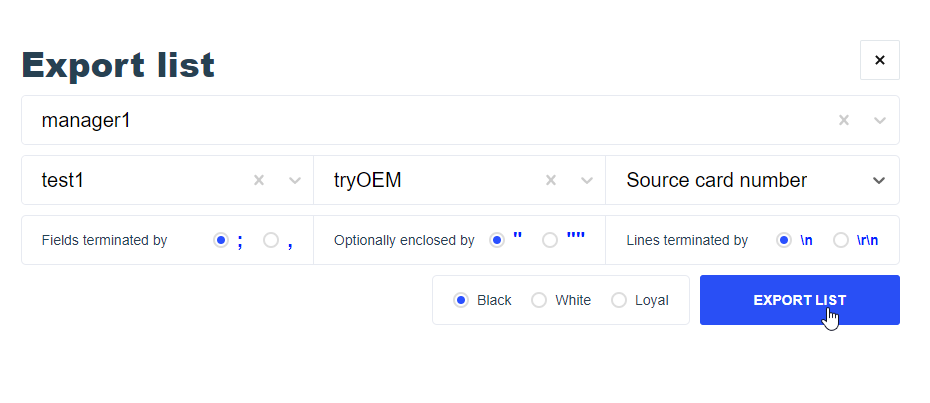 In order to select entries from list, specify manager and merchant/gate/processor for corresponding lists from dropdown menu.