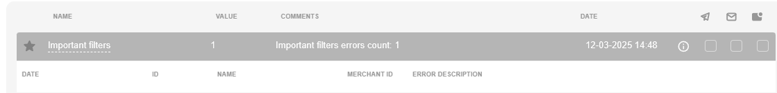 Notifications can be created for cases in which transactions were filtered due to the one of the following filters: