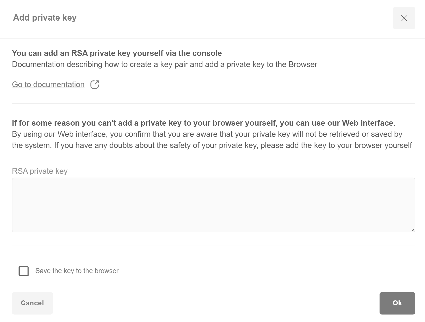 If private key have been integrated into the browser, but it is impossible to make a transactions, please, clear browser’s cache and try again to integrate the private key.
