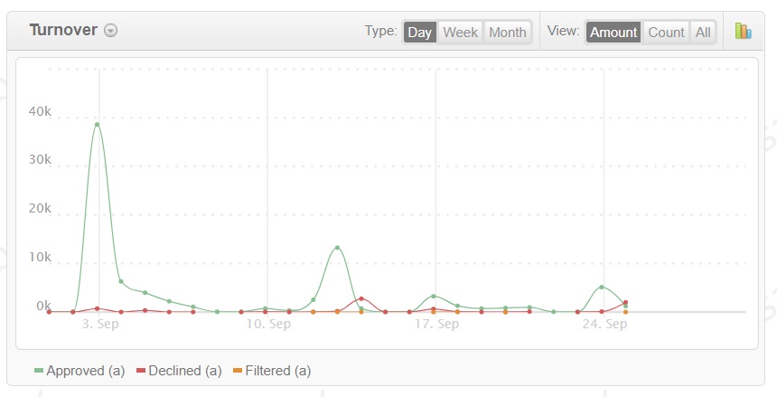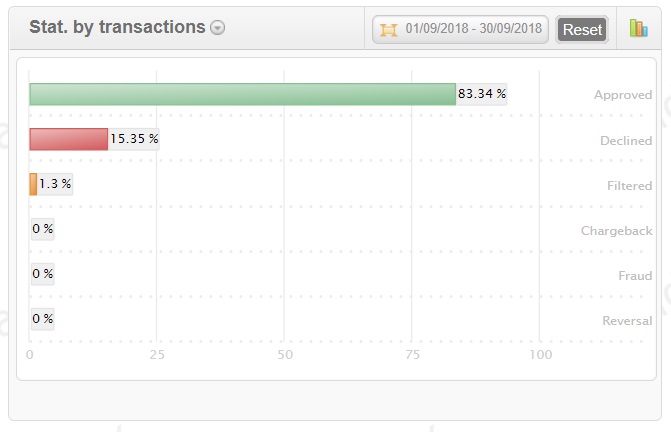 можно выбрать следующие графики: соотношение по объему транзакций или по сумме платежей, а также по типу транзакций (продажа, списание, перевод и т. д.). Платежный шлюз EPSHB также отображает статистику по отрицательной активности и доходам.