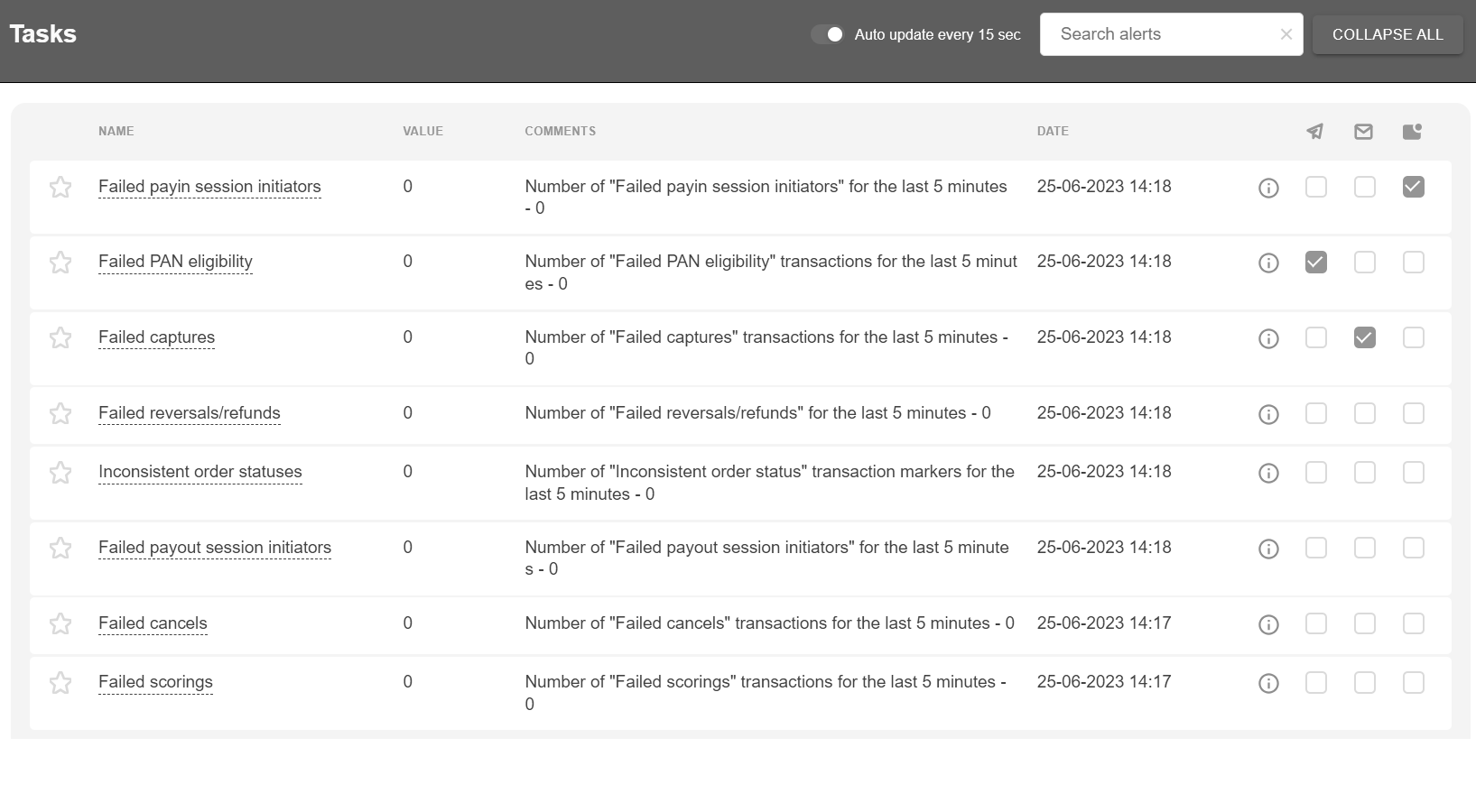 Экран Онлайн-мониторинга находится в разделе “Инструменты” — “Мониторинг”. Здесь отображается информация о различных ошибках, требующих незамедлительного реагирования. Также присутствует возможность подписки на уведомления о любых ошибках через Telegram, электронную почту или Push-уведомления.